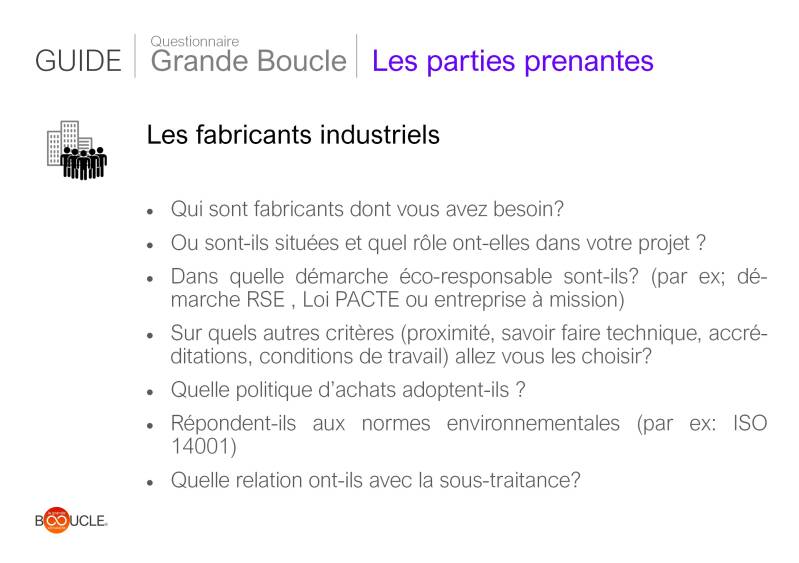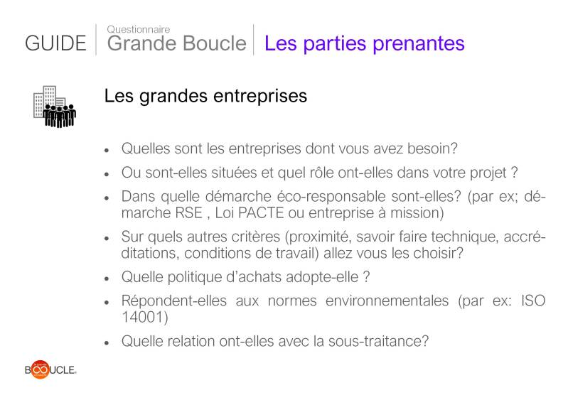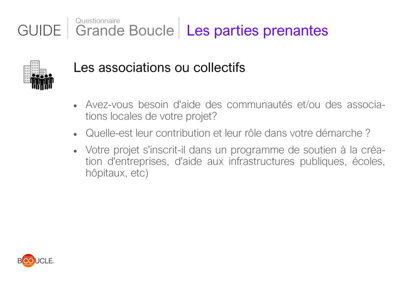 Les cartes questionnaire Grande Boucle des outils d'orientation et d'aide à la décision à utiliser en suivant le schéma de la Grande Boucle Circulaire. Celles-ci contiennent 2 parties: le cycle de vie et les parties prenantes. Pour chaque catégorie, il s'agit de parcourir et de répondre aux questions des différents étapes du cycle de vie mais aussi de prendre en compte l'impact des parties prenantes associées à votre projet. Il n'y a pas d'ordre particulier, celui-ci peut se faire selon les spécificités ou les priorités du projet.
